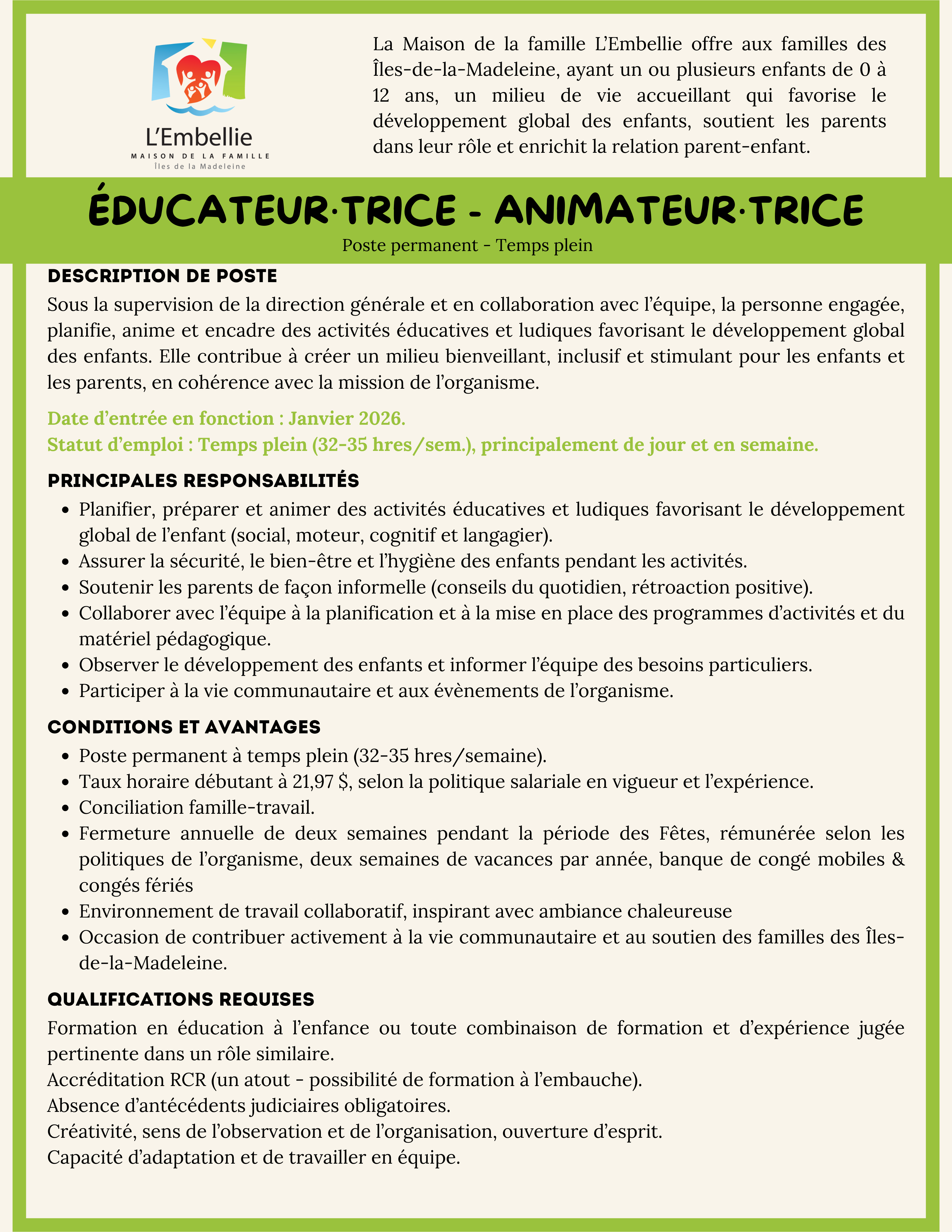 Sous la supervision de la direction générale et en collaboration avec l’équipe, la personne engagée, planifie, anime et encadre des activités éducatives et ludiques favorisant le développement global des enfants. Elle contribue à créer un milieu bienveillant, inclusif et stimulant pour les enfants et les parents, en cohérence avec la mission de l’organisme.